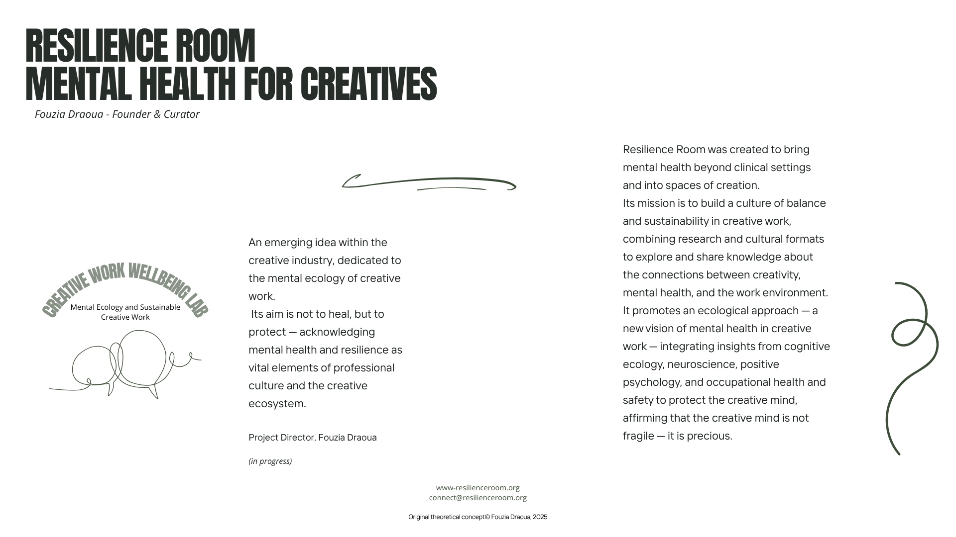 Resilience Room is where my professional paths meet — psychology, occupational health, and neuroscience, An innovative project designed to bring mental health beyond clinical spaces and into the heart of creative work.