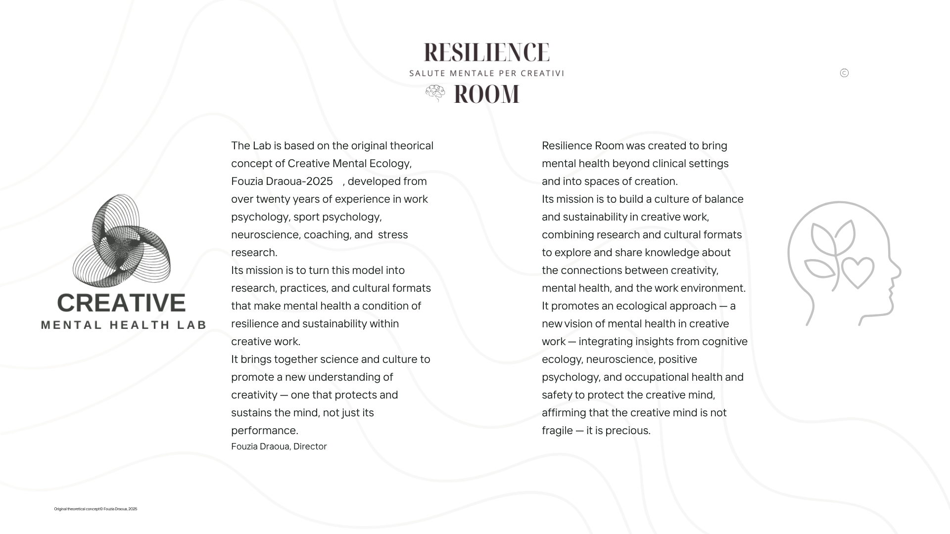 Resilience Room is where my professional paths meet — psychology, occupational health, and neuroscience, An innovative project designed to bring mental health beyond clinical spaces and into the heart of creative work.