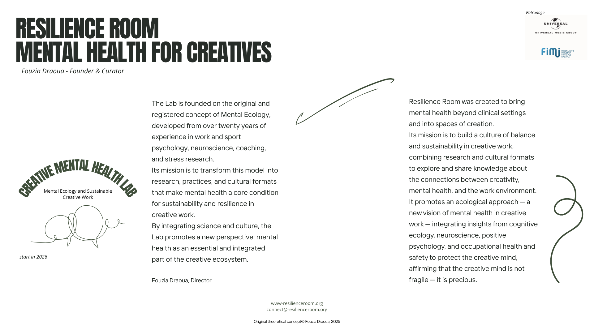 Resilience Room is where my professional paths meet — psychology, occupational health, and neuroscience, An innovative project designed to bring mental health beyond clinical spaces and into the heart of creative work.